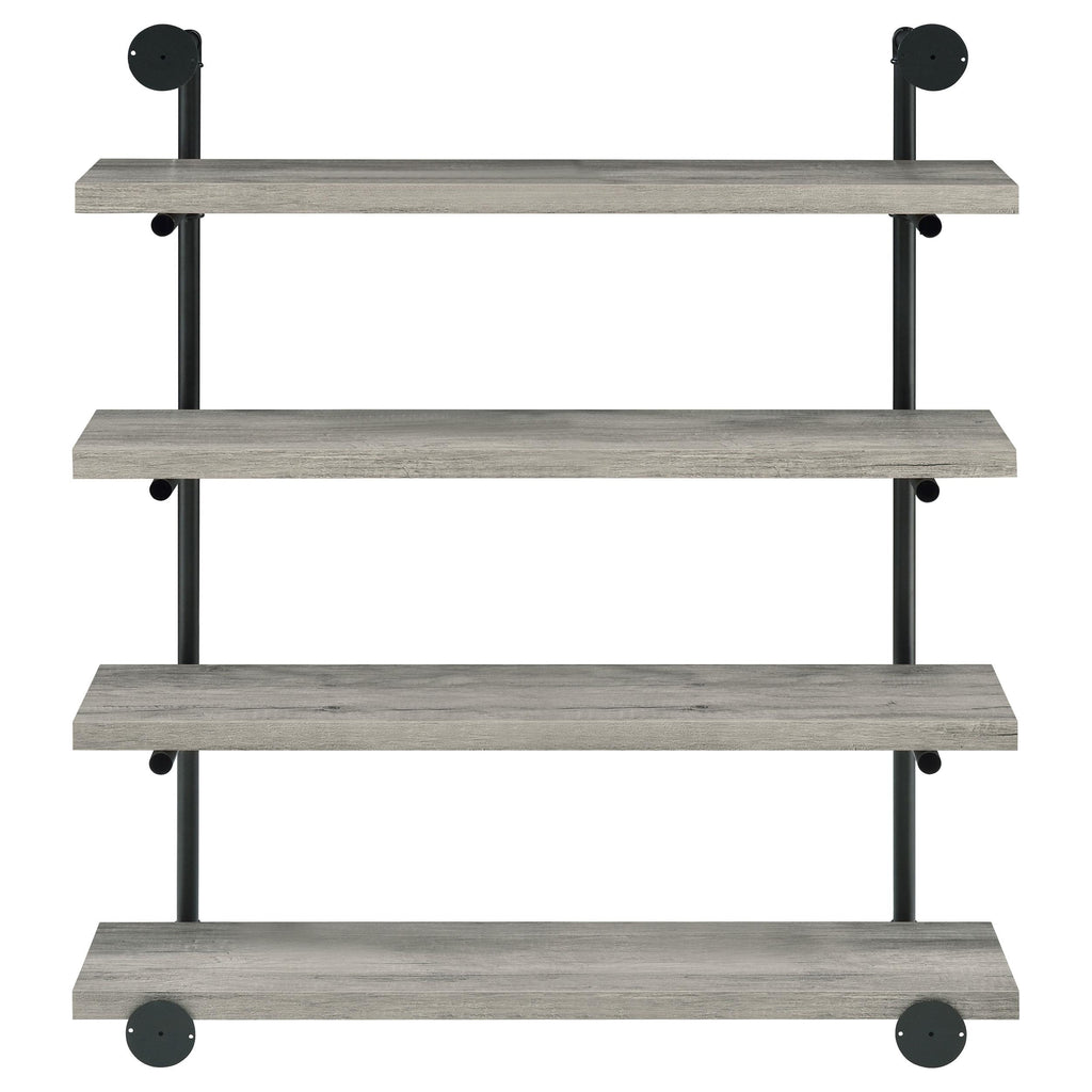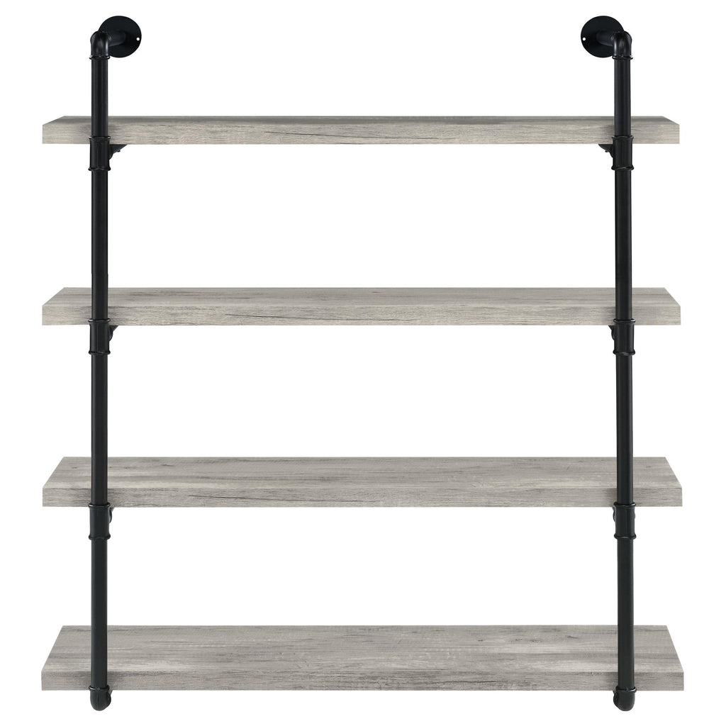 • Industrial style wall-mounted shelf in grey driftwood finish with black plumbing pipe metal frame