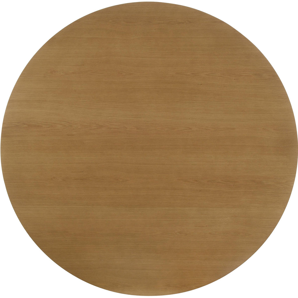 • Round dining table features a wide white oak veneer top in a natural light brown wood finish