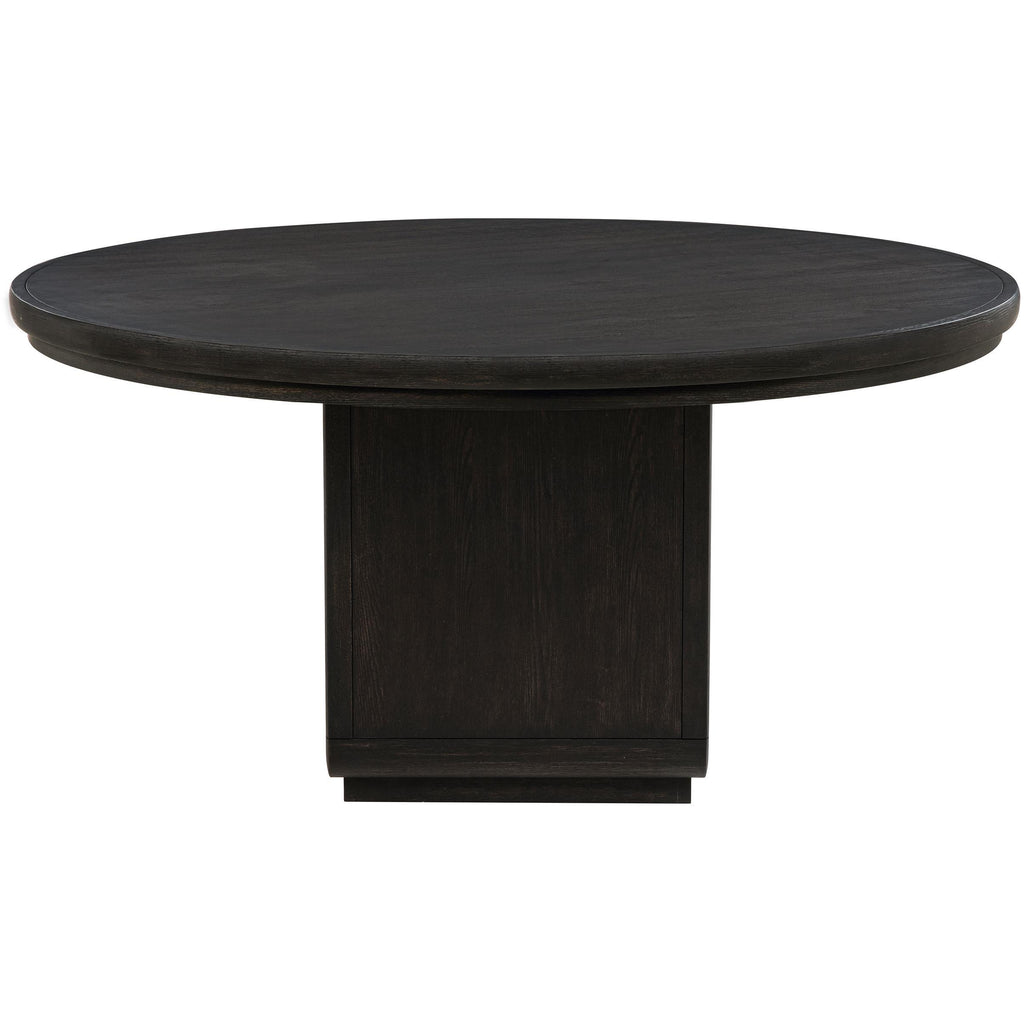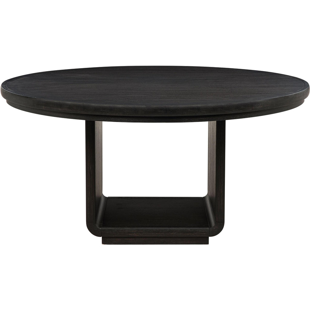 • Sixty-inch round dining table finished in burnished black for a dramatic modern presence
