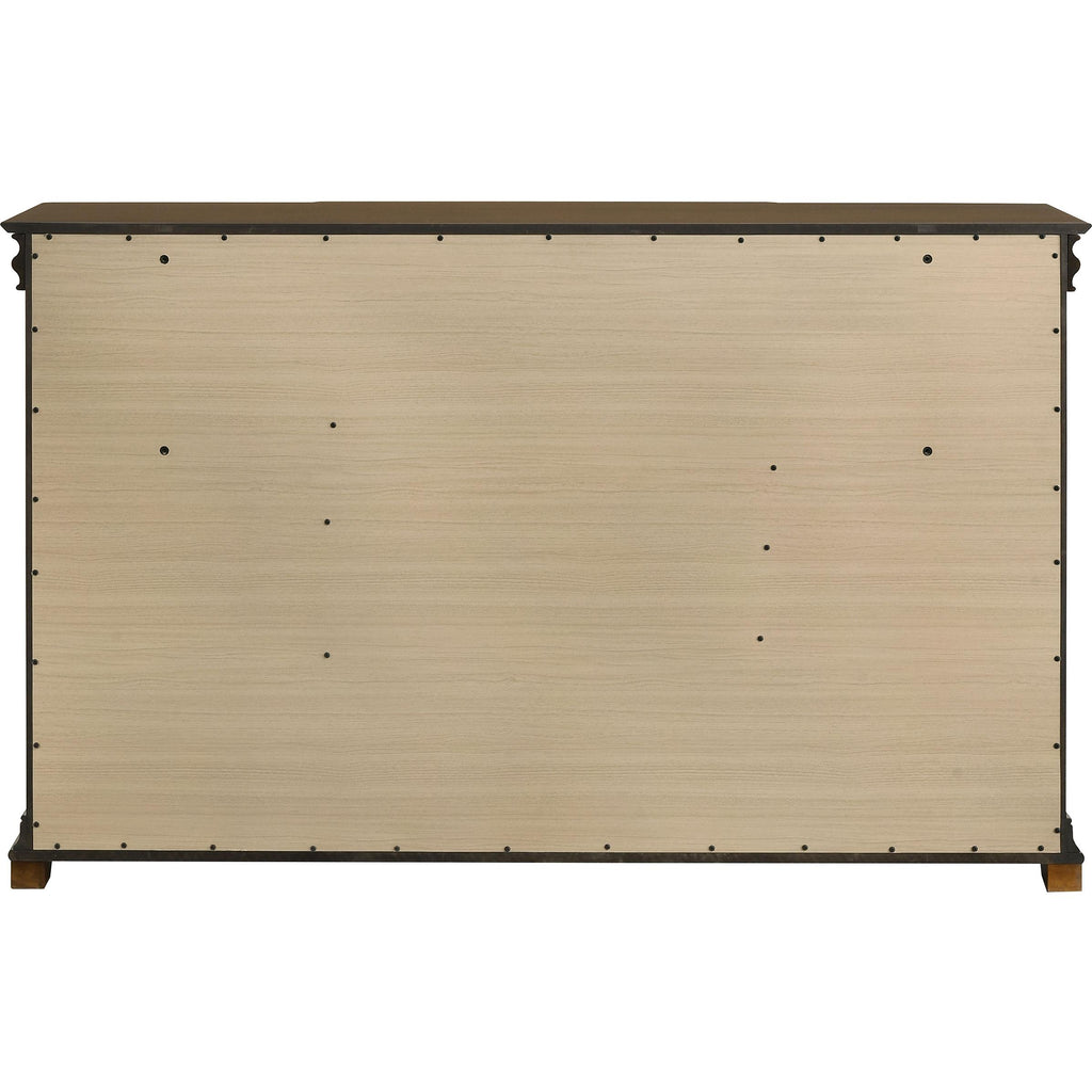 • Dresser includes nine main drawers with crown molding and classic shaping