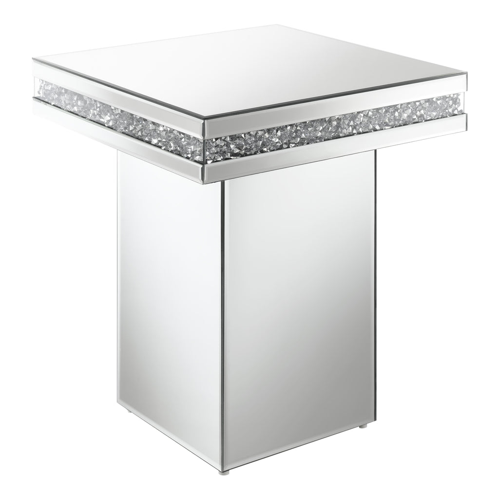 Showcase sculptures and decor on this stunning, modern glam accent table. A square table sits on a tall square pedestal... Showcase sculptures and decor on this stunning, modern glam accent table. A square table sits on a tall square pedestal for an edgy, bold expression. Smooth mirror trim and surfaces cover every edge, creating a sleek flair. Glittering acrylic crystals line the interior of a clear center band for an elevated luxurious touch. Small disguised feet offer a subtle elevation over rugs and floors and offer extra stability. View more