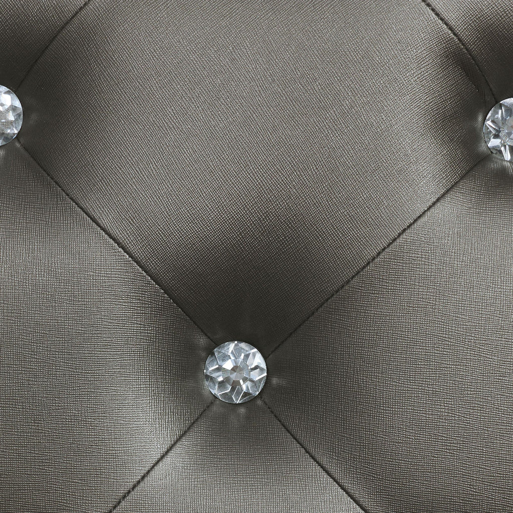 • Bed is upholstered with metallic leatherette, fully tufted with crystal buttons