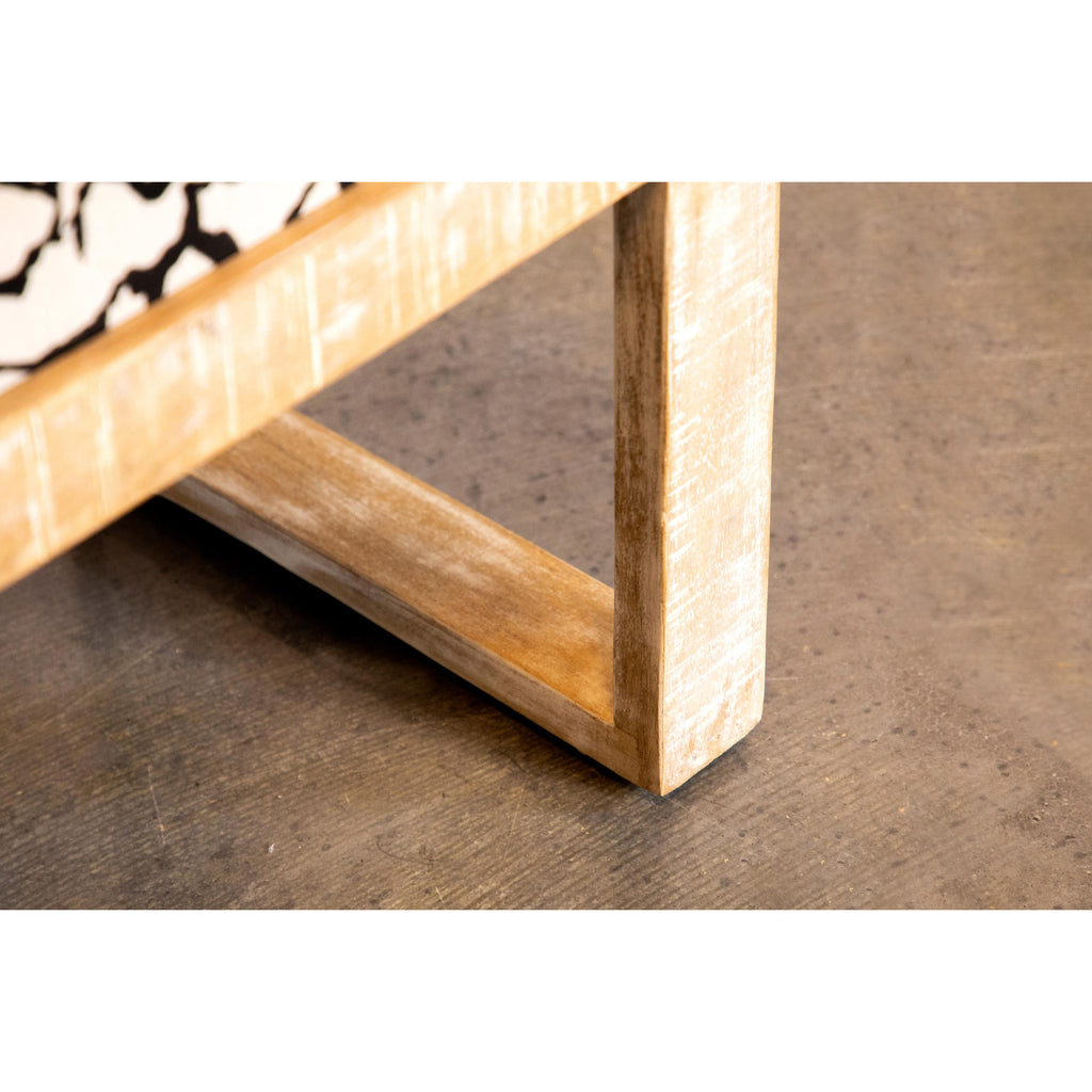This unexpected accent bench provides a unique element in your living space. Its soft abstract fabric brings plenty of visual... This unexpected accent bench provides a unique element in your living space. Its soft abstract fabric brings plenty of visual appeal. With a black and white motif, you can easily blend it in with your existing decor. The wood frame of the bench is weathered for a slightly rustic appeal. Place this piece in an entryway and instantly improve its style. View more