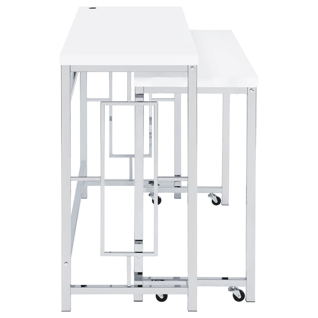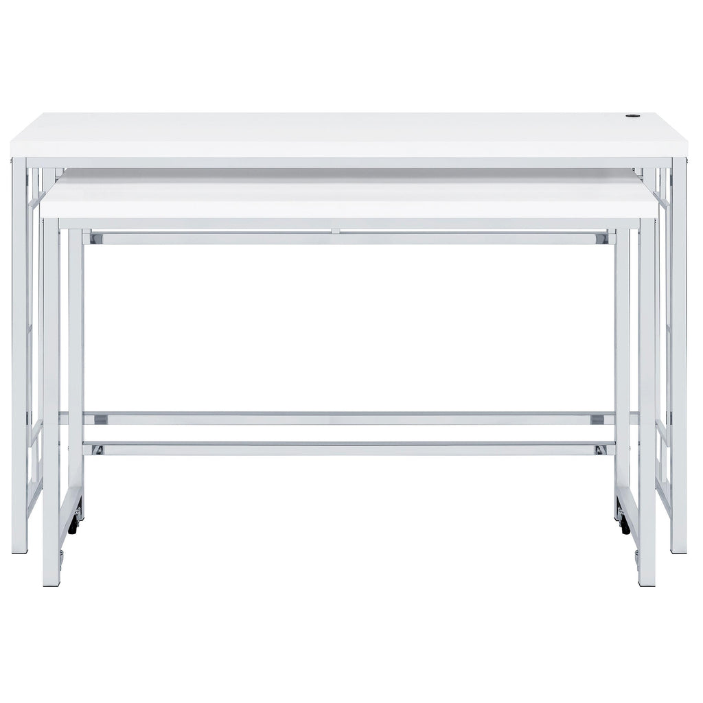 Smaller table is on wheels and nests under the larger, which includes a USB port in the tabletop
