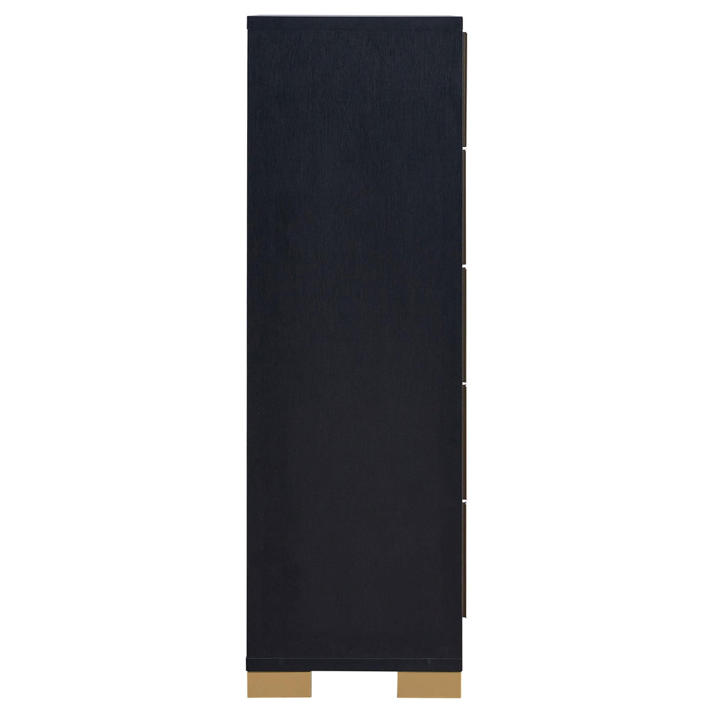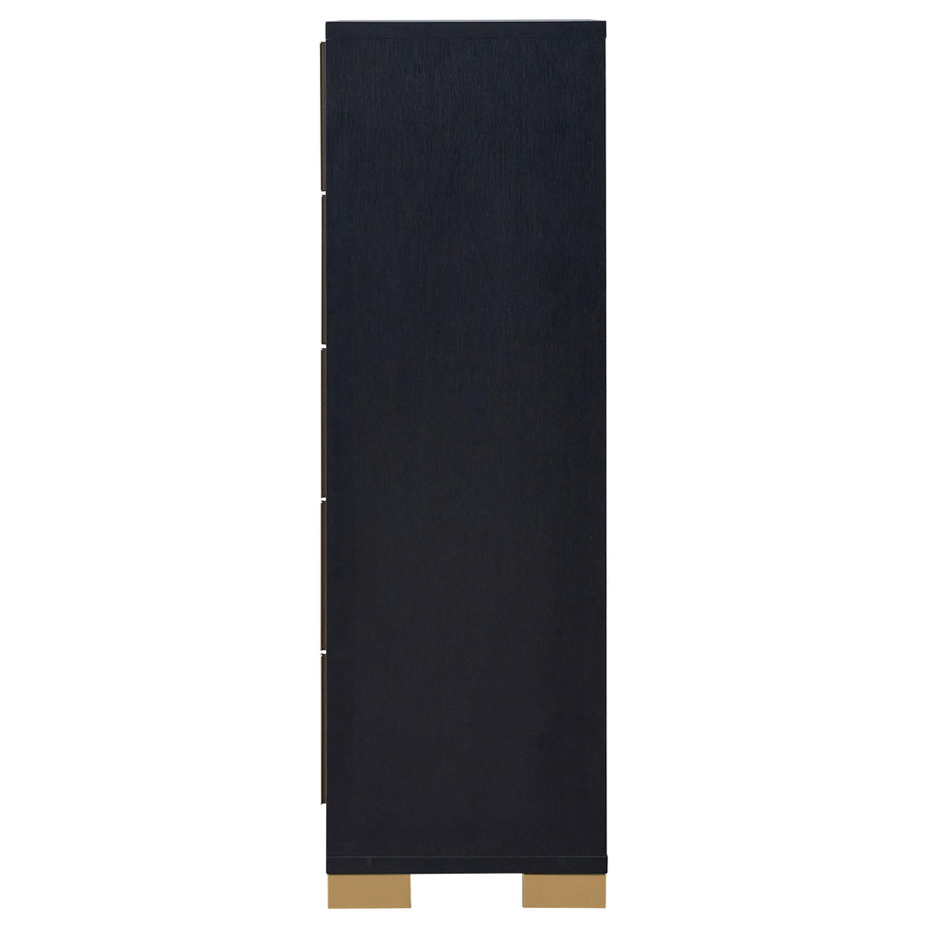 • Elegant five-drawer chest with modern design details and Art Deco vibe
