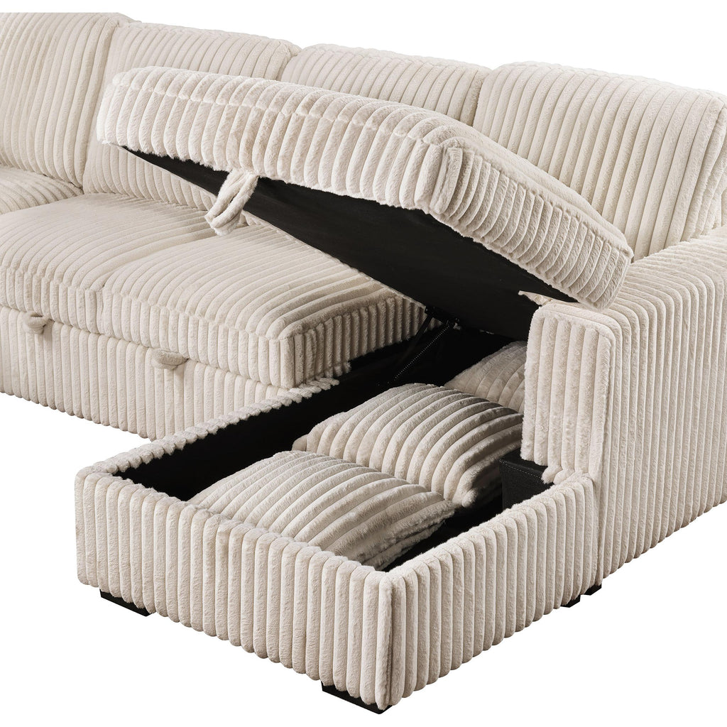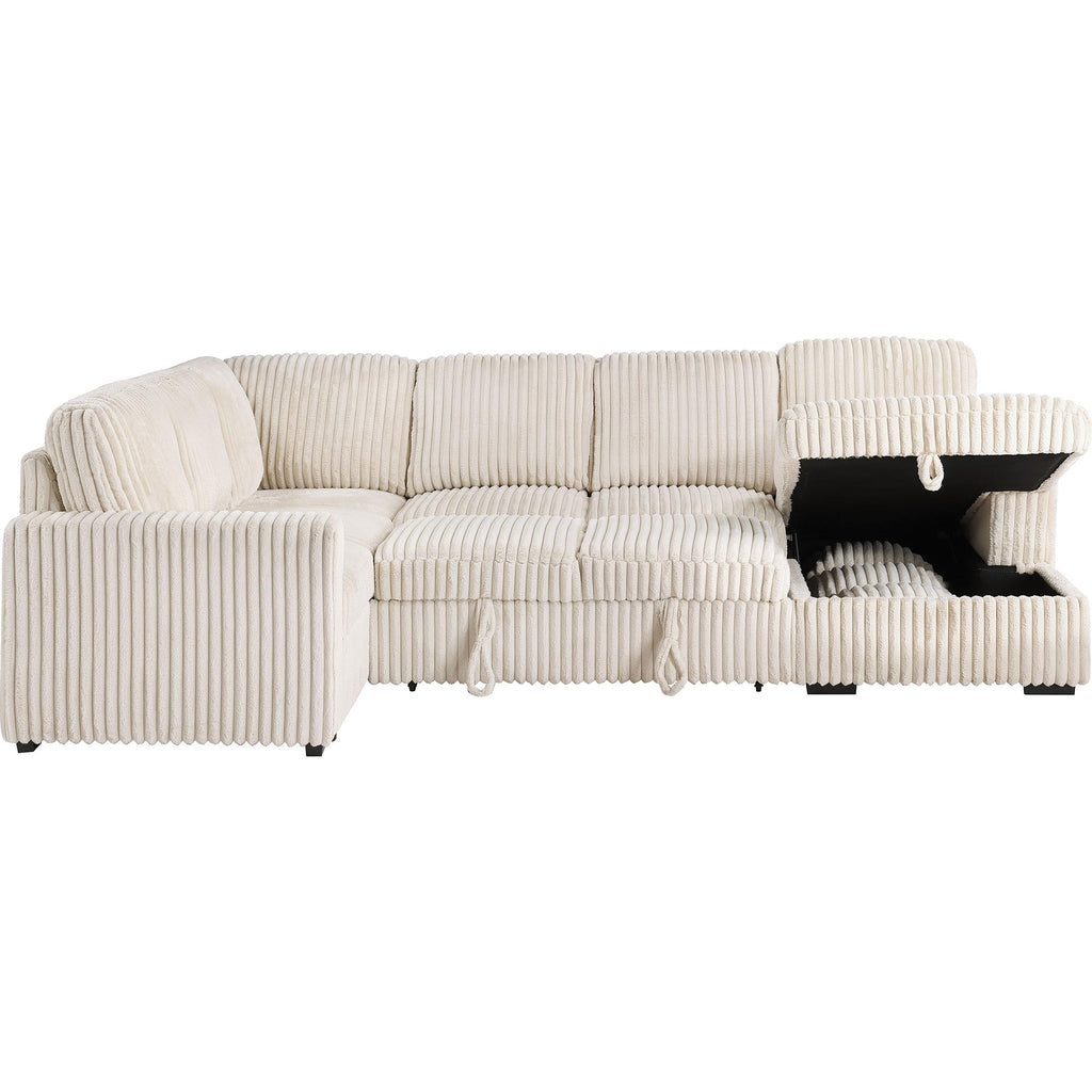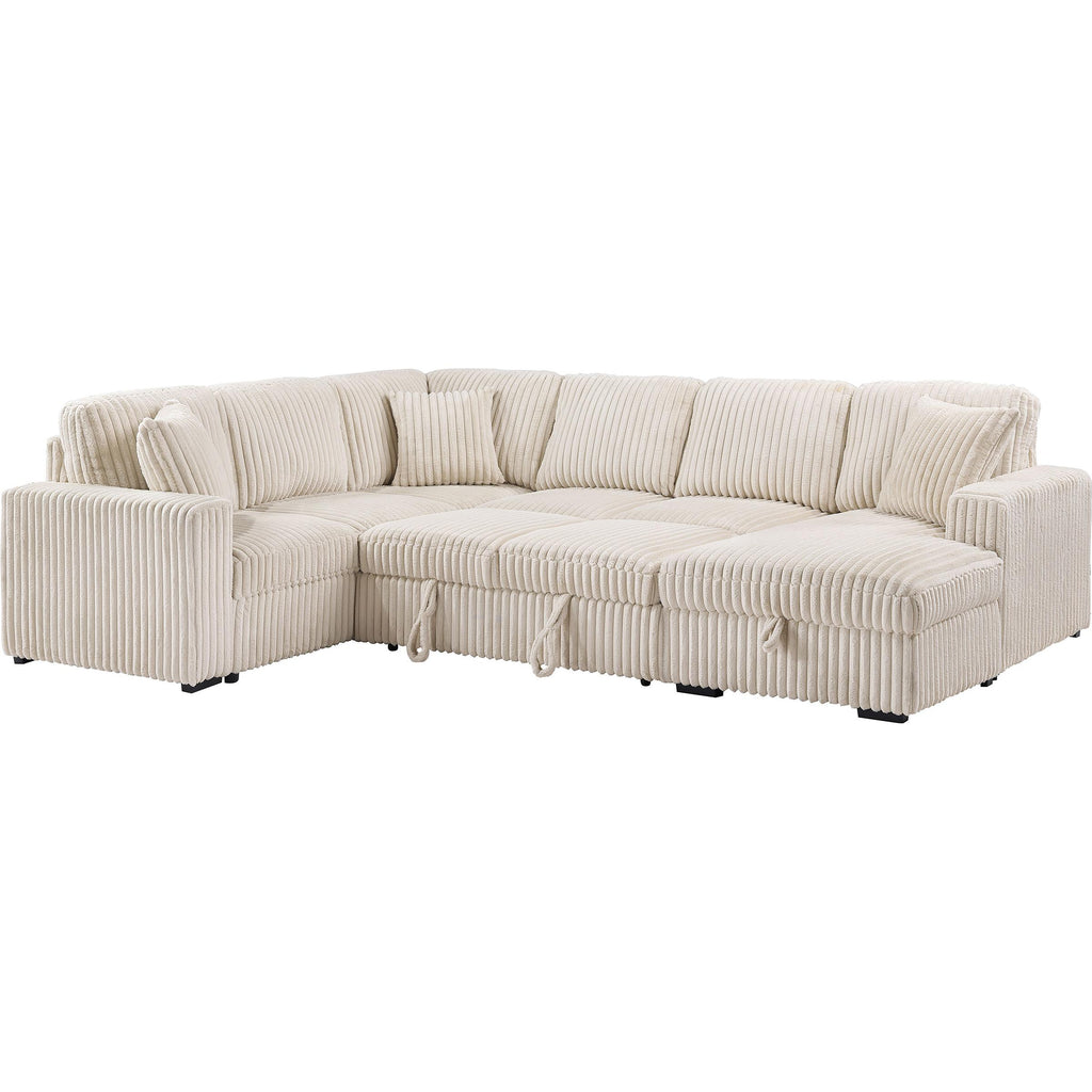 This versatile corduroy sleeper sectional effortlessly converts from cozy seating to a comfortable guest bed with its pop-up sleep surface.... This versatile corduroy sleeper sectional effortlessly converts from cozy seating to a comfortable guest bed with its pop-up sleep surface. A spacious storage chaise keeps essentials at hand, while plush upholstery and three matching pillows provide lasting comfort and style. Its neutral tone complements any décor, making this piece an ideal centerpiece for relaxation, entertainment, and accommodating overnight guests. Built for durability, it seamlessly blends form, function, and modern appeal. View more