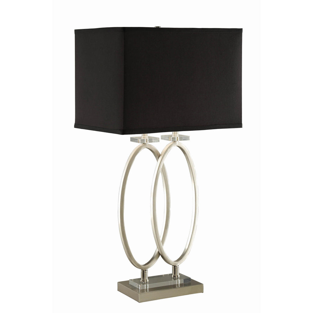• Contemporary sculptural lamp features twin standing rings on a rectangle foot