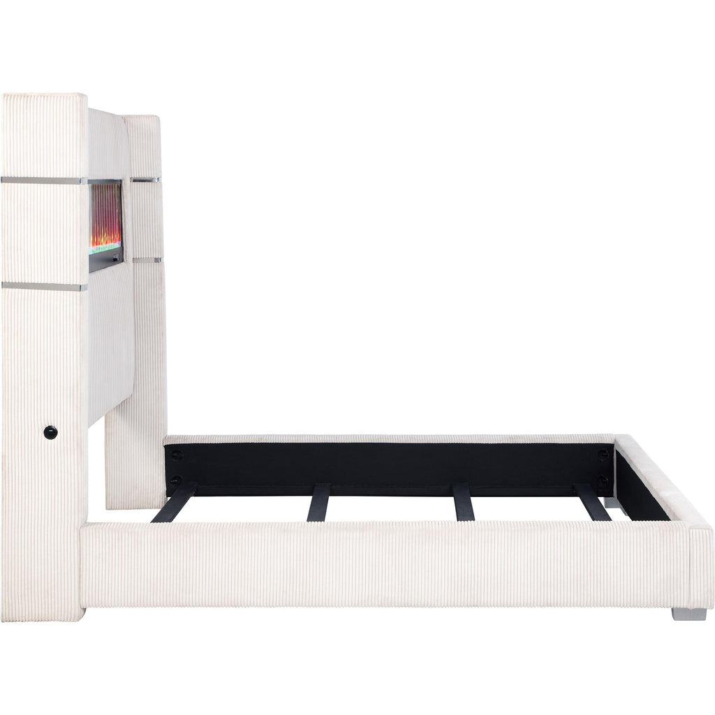 Transform any bedroom into a captivating sanctuary with this show-stopping bed, designed to draw attention and invite comfort. Available in... Transform any bedroom into a captivating sanctuary with this show-stopping bed, designed to draw attention and invite comfort. Available in plush corduroy upholstery, this bed effortlessly blends soft texture with modern sophistication. The integrated flame box offers a mesmerizing visual with 16 adjustable color options, all controlled via a convenient remote. With its eye-catching design and cozy feel, this bed elevates the bedroom experience while offering a stylish focal point. View more