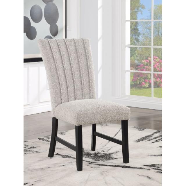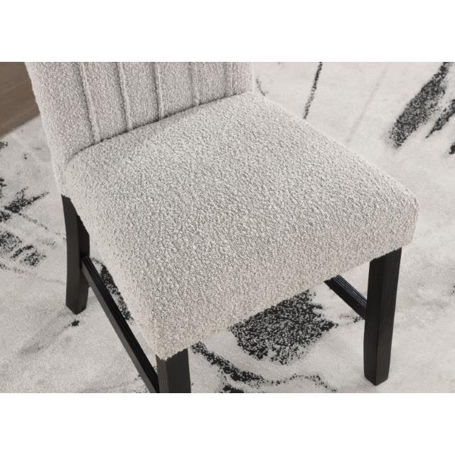 Spice up your space with an unexpected twist in textures! An interesting take on the classic parson chair, these are... Spice up your space with an unexpected twist in textures! An interesting take on the classic parson chair, these are upholstered in boucle fabric with vertical pleats that add visual height. Black-finished legs and stretcherss ensure that the fabric is the star of the show. View more