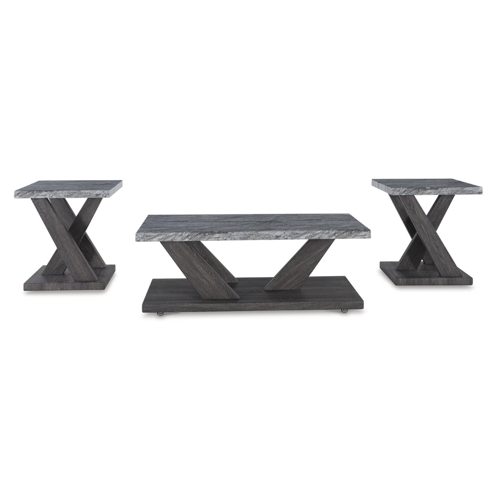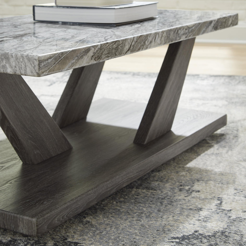 Live in luxurious harmony (without breaking the bank) when you stage this table set in your seating area. Dynamic weathered... Live in luxurious harmony (without breaking the bank) when you stage this table set in your seating area. Dynamic weathered gray bases act as the foundation for faux gray marble tops. Très chic. Your contemporary living room has never been so stylishly coordinated. And for must-have function, the coffee table's built-in casters have you covered. View more