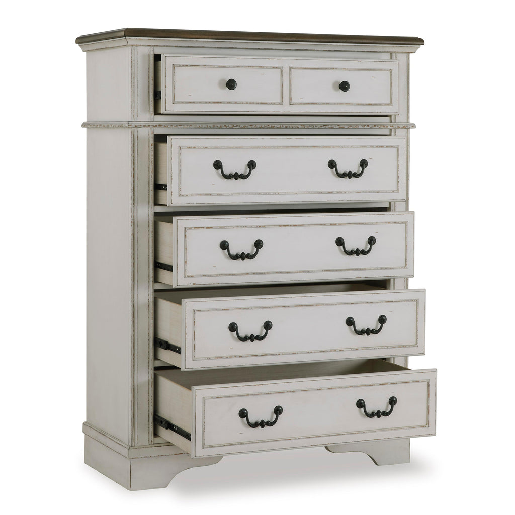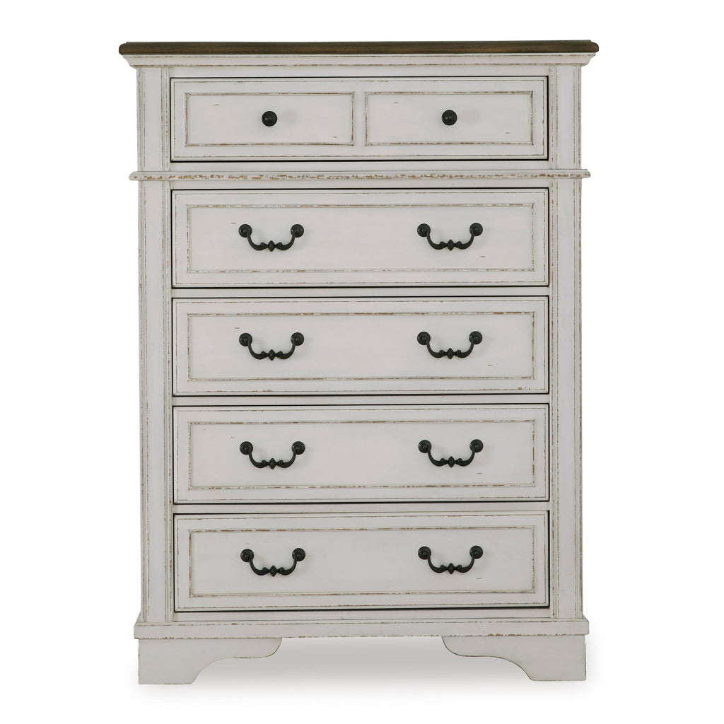 • 5 smooth-gliding drawers with fully finished interiors, dovetail construction and metal ball-bearing side glides (top drawer felt lined)