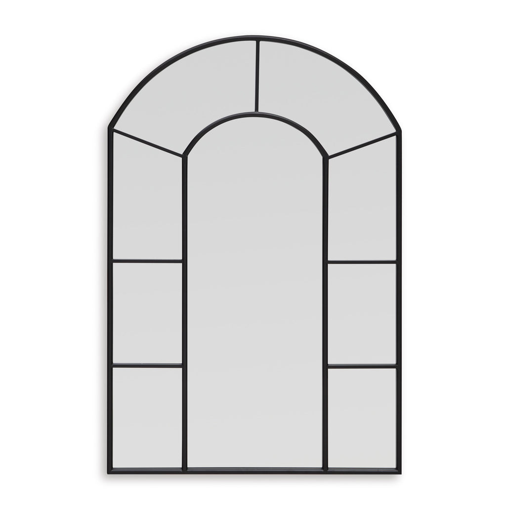 This mirror takes a classic wall accent and upgrades it with simple details. An arched design and paneled perimeter are... This mirror takes a classic wall accent and upgrades it with simple details. An arched design and paneled perimeter are framed with metal in a versatile black finish. Whether your room is casual or contemporary, this mirror effortlessly reflects the mood of your space. View more