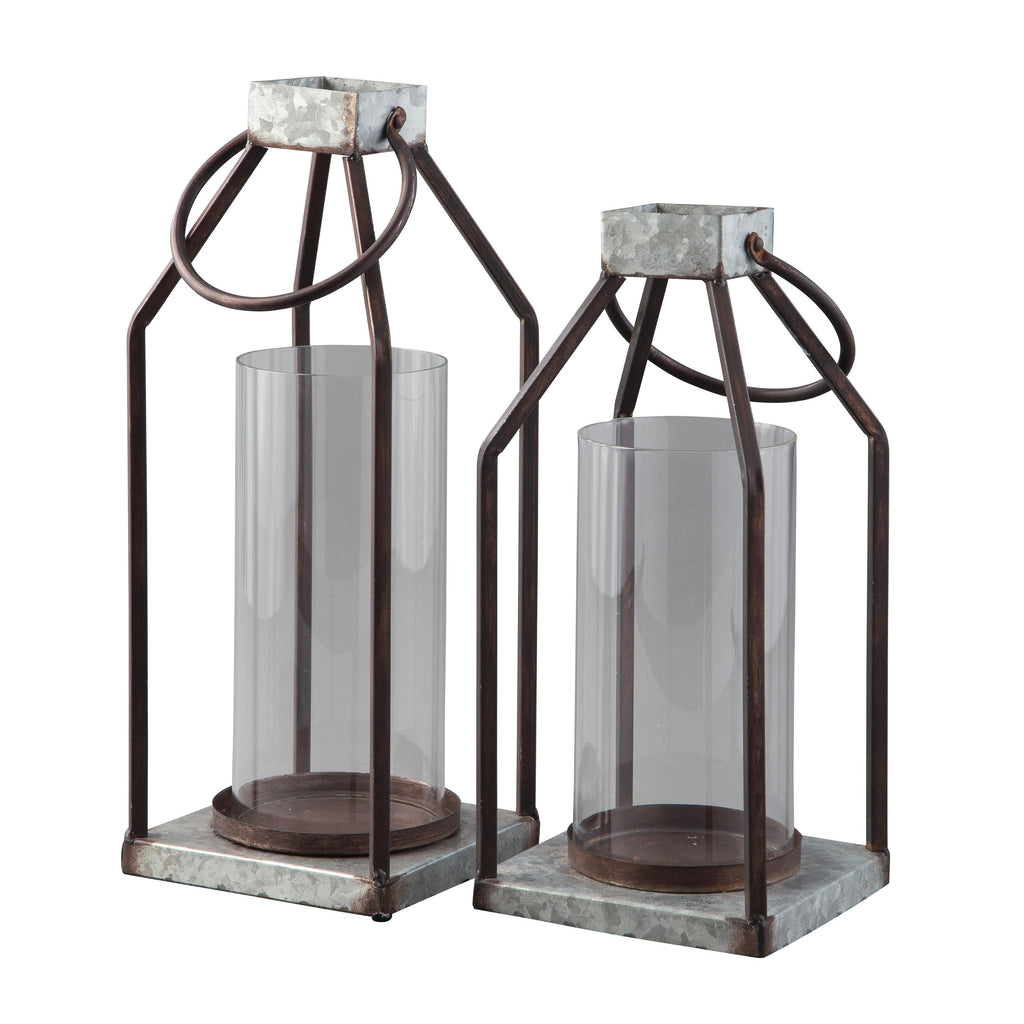 Whoever said you can’t illuminate in style? The pieces in this lantern set act as beautiful vessels for the romantic... Whoever said you can’t illuminate in style? The pieces in this lantern set act as beautiful vessels for the romantic glow of pillar candles, whether placed in an indoor or outdoor space. The galvanized metal offers decor versatility, and the top metal handle and glass hurricane shade make each lantern oh-so-easy to transport. View more