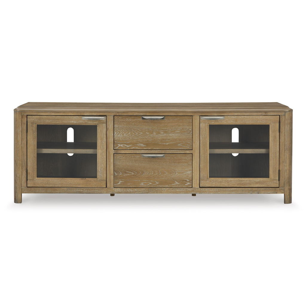 This TV stand's classic yet contemporary good looks are hard to deny. Softly shaped posts with a light oak finish... This TV stand's classic yet contemporary good looks are hard to deny. Softly shaped posts with a light oak finish and wire-brushed wood grain texture lend an organic appeal to your entertainment space. Roomy drawers are just the ticket for extra media storage and keeping day-to-day clutter at bay, while the shelf is ideal for fashionable display pieces. View more