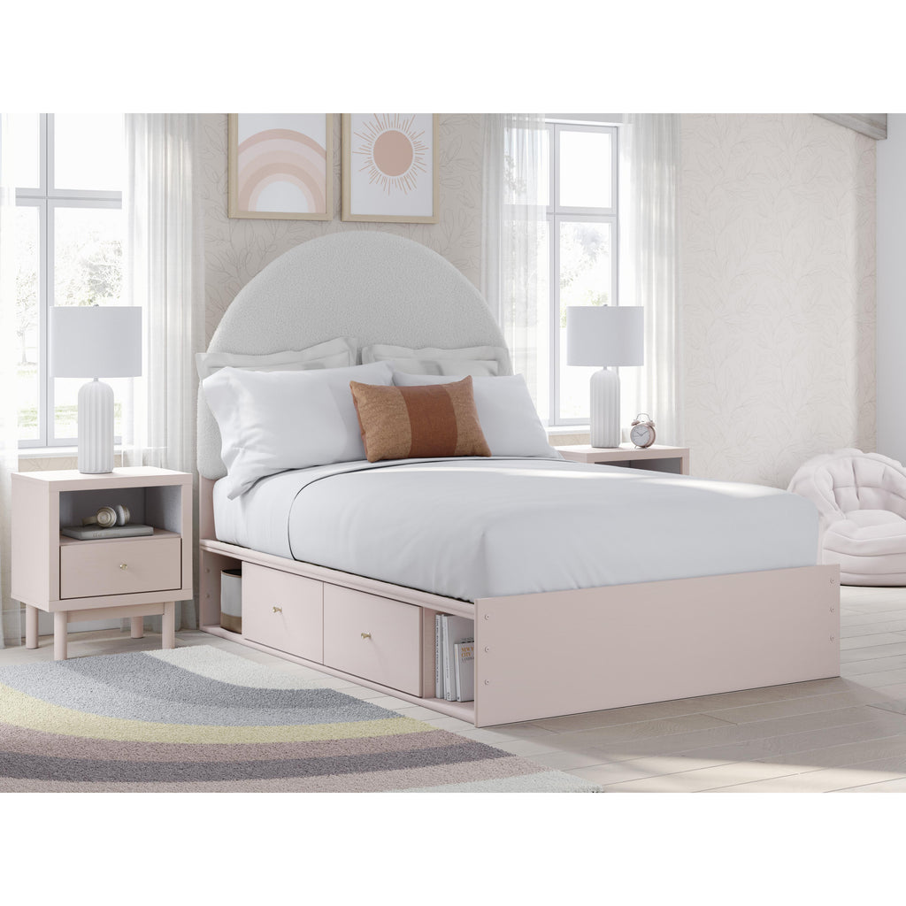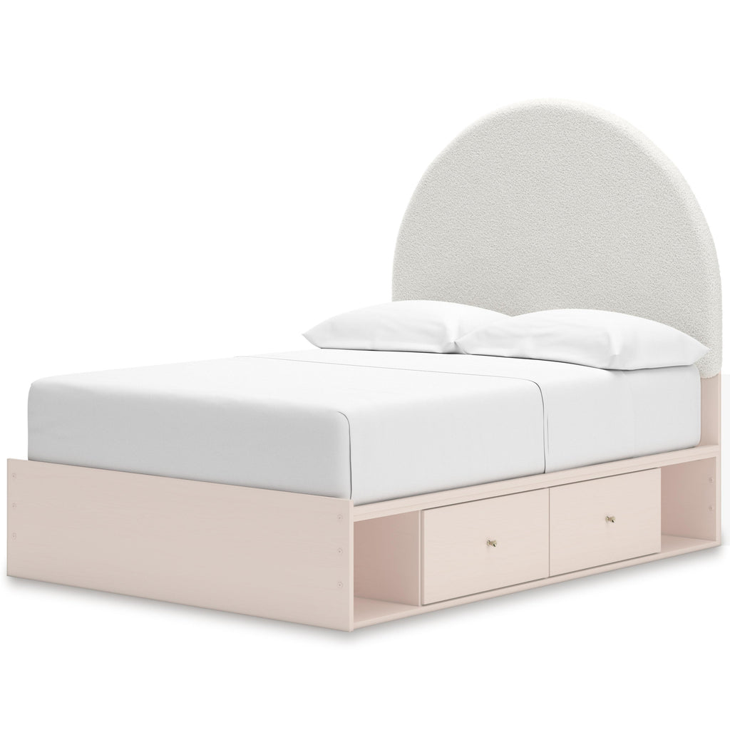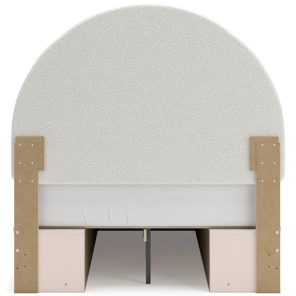• Includes upholstered panel headboard, 2 side rails with storage, panel footboard and roll slats